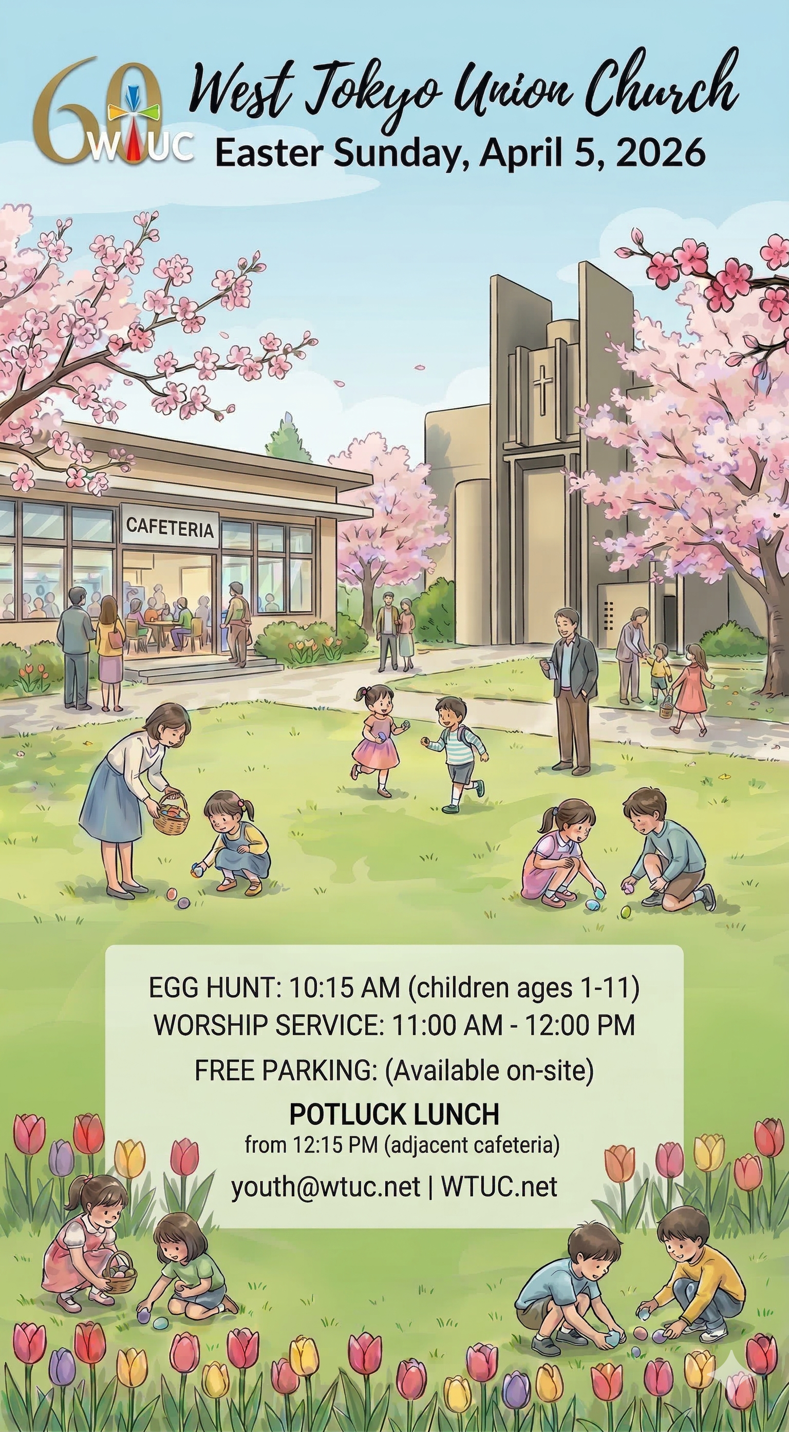 Come join us as we worship the living God and celebrate Christ’s resurrection at West Tokyo Union Church! We will be gathering in-person on the campus of Japan Lutheran Seminary in Mitaka. Please come worship with us! We will also be observing the Lord’s Supper.